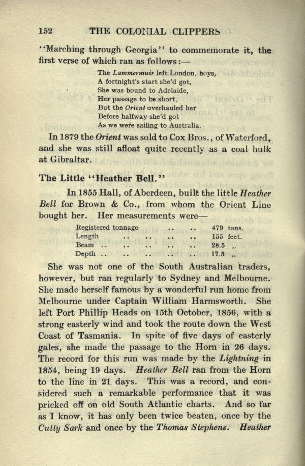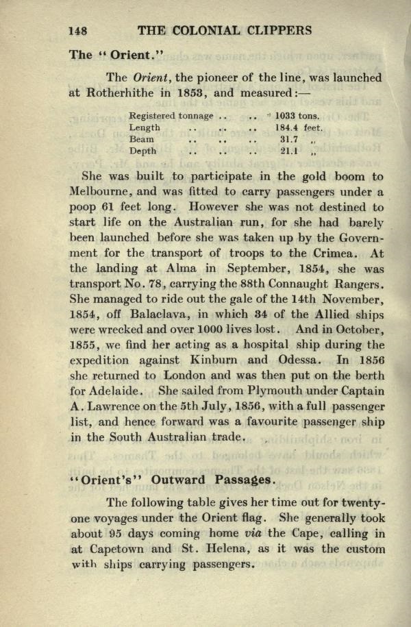 She was built to participate in the gold boom to Melbourne, and was fitted to carry passengers under a poop 61 ft long. However, she was not destined to start life on the Australian run, for she had barely been launched before she was taken up by the Government for the transport of troops to the Crimea. At the landing at Alma in September, 1854, she was transport No. 78, carrying the 88th Connaught Rangers. She managed to ride out the gale on the 14th November, 1854, off Balaclava, in which 34 of the Allied ships were wrecked and over 1000 lives lost. And in October, 1855, we find her acting as a hospital ship during the expedition against Kinburn and Odessa. In 1856 she returned to London and was then put on the berth for Adelaide. She sailed from Plymouth under Captain A. Lawrence on the 5th July, 1856, with a full passenger list, and hence forward was a favourite passenger ship in the South Australian trade.