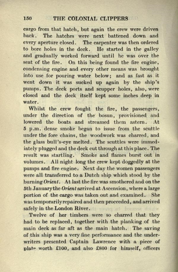 While the crew fought the fire, the passengers, under the direction of the bosun, provisioned and lowered the boats and streamed them astern. At 5 p.m. dense smoke began to issue from the scuttle under the fore cabins, the woodwork was caharred, and the glass bull's-eye melted. The scuttles were immediately plugged and the deck cut through at this place. The result was startling . Smoke and flames burst out in volumes. All night long the crew kept doggedly at the pumps and fire engine. Next day the women passengers were all transferred to a Dutch ship which stood by the burning Orient. At last the fire was smothered and on the 5th January the Orient arrived in Ascension, where a large portion of the cargo was taken out and examined. She was temporarily repaired and then proceeded, and arrived safely in the London River.