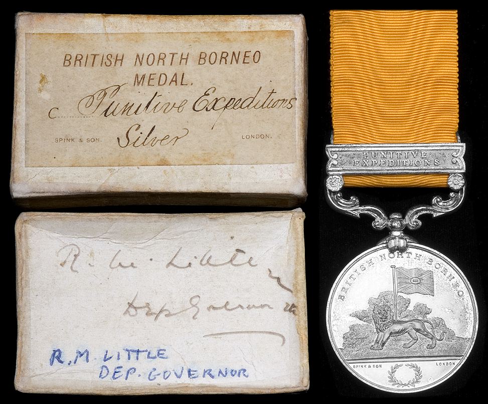 British North Borneo Company Medal 1897–1916, silver, 1 clasp, Punitive Expeditions (R. M. Little, Esq.) engraved naming, with original watered silk ribbon and contained in its original Spink & Son, London card box of issue, the lid inscribed in ink 'Punitive Expeditions Silver', the bottom also with contemporary inscription in ink 'R. M. Little Dep. Governor' and repeated in later ball-point, some careful restoration to box, otherwise extremely fine and of the highest rarity being one of only five original issues in silver £5000-6000.