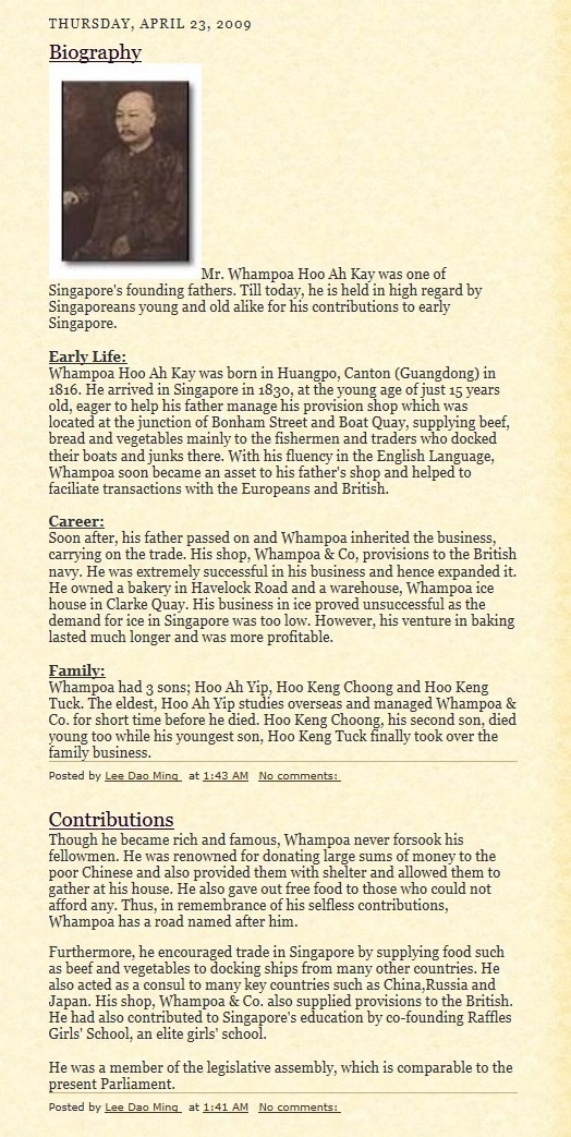 Born at Whampoa, near Canton, and was so nick-named. His firm were contractors to the Royal Navy and suppliers to merchant shipping visiting the port. One of the few of his countrymen to speak English, used his success to play host and be the centre of social life. His hospitality was generous and he was the most respected and best liked Chinaman in Singapore. He played host to many visiting Naval officers including Admiral Keppel in 1848. He became a member of the Legislative Council, also a true friend and patient of Dr Robert Little, to whom he presented a claret jug (it was willed by Col William Campbell Little to the family of Robert & Ruby McEwen). He died in 1880.