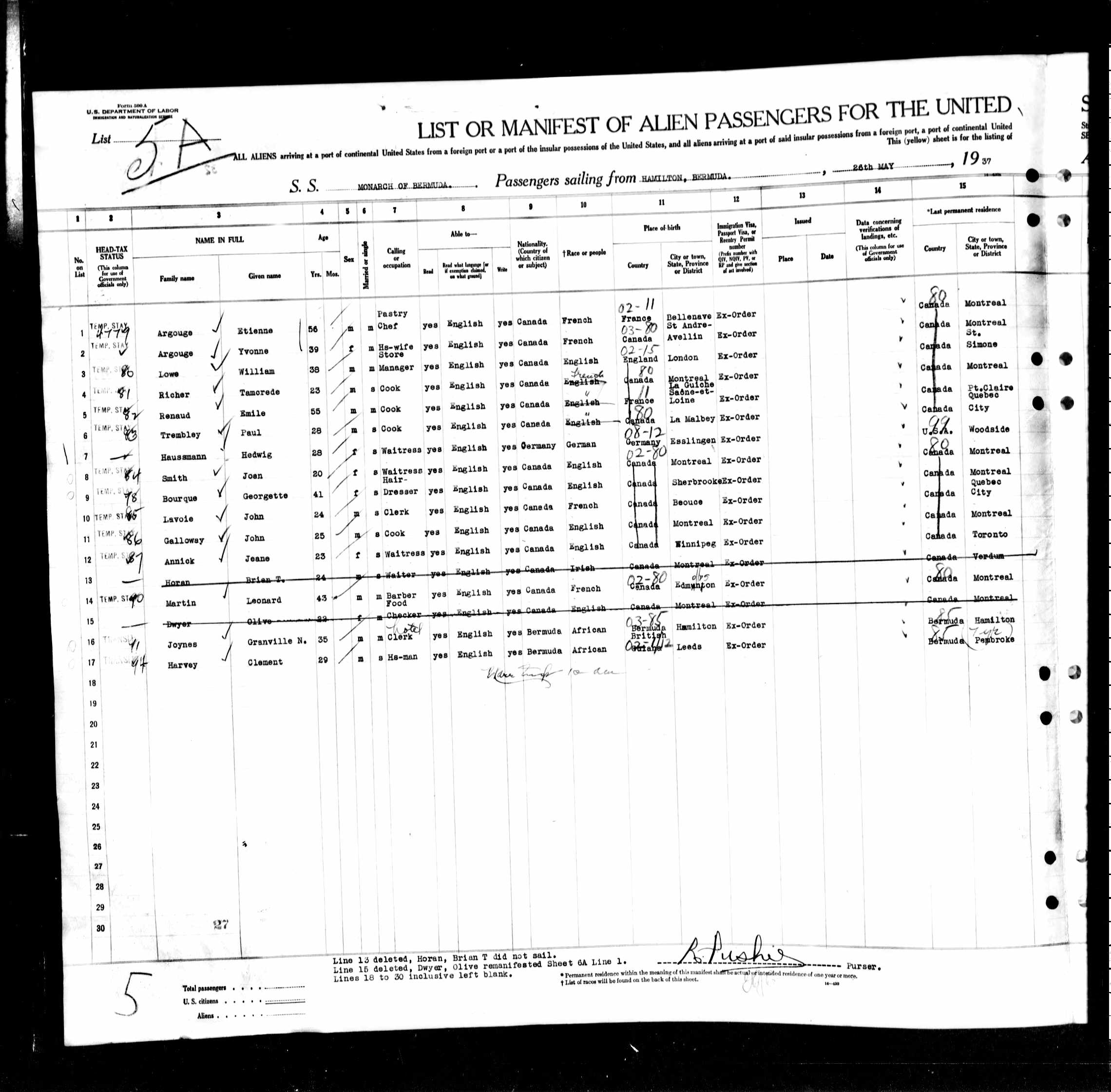 The Passenger List (in which he is revealed as one of the ship's cooks) also tells us that he still lived at the city (as of 2006) of Pointe Claire in Quebec, just as he had in 1921. Perhaps he had reached that saddle-point in life at which by paddling reasonably hard you stay clear of the downstream Niagara but you're never going to make it to the upstream Shangri-La.