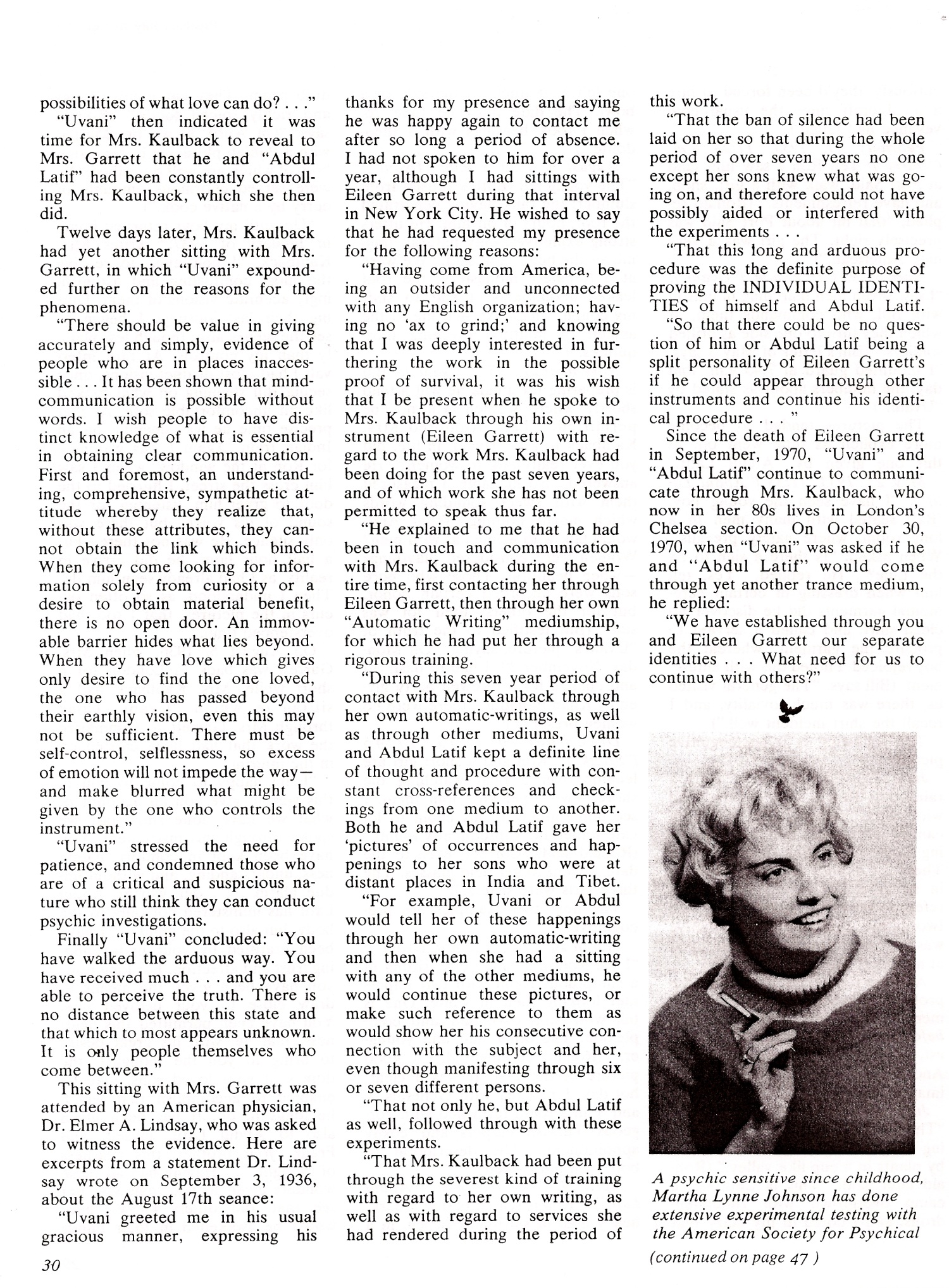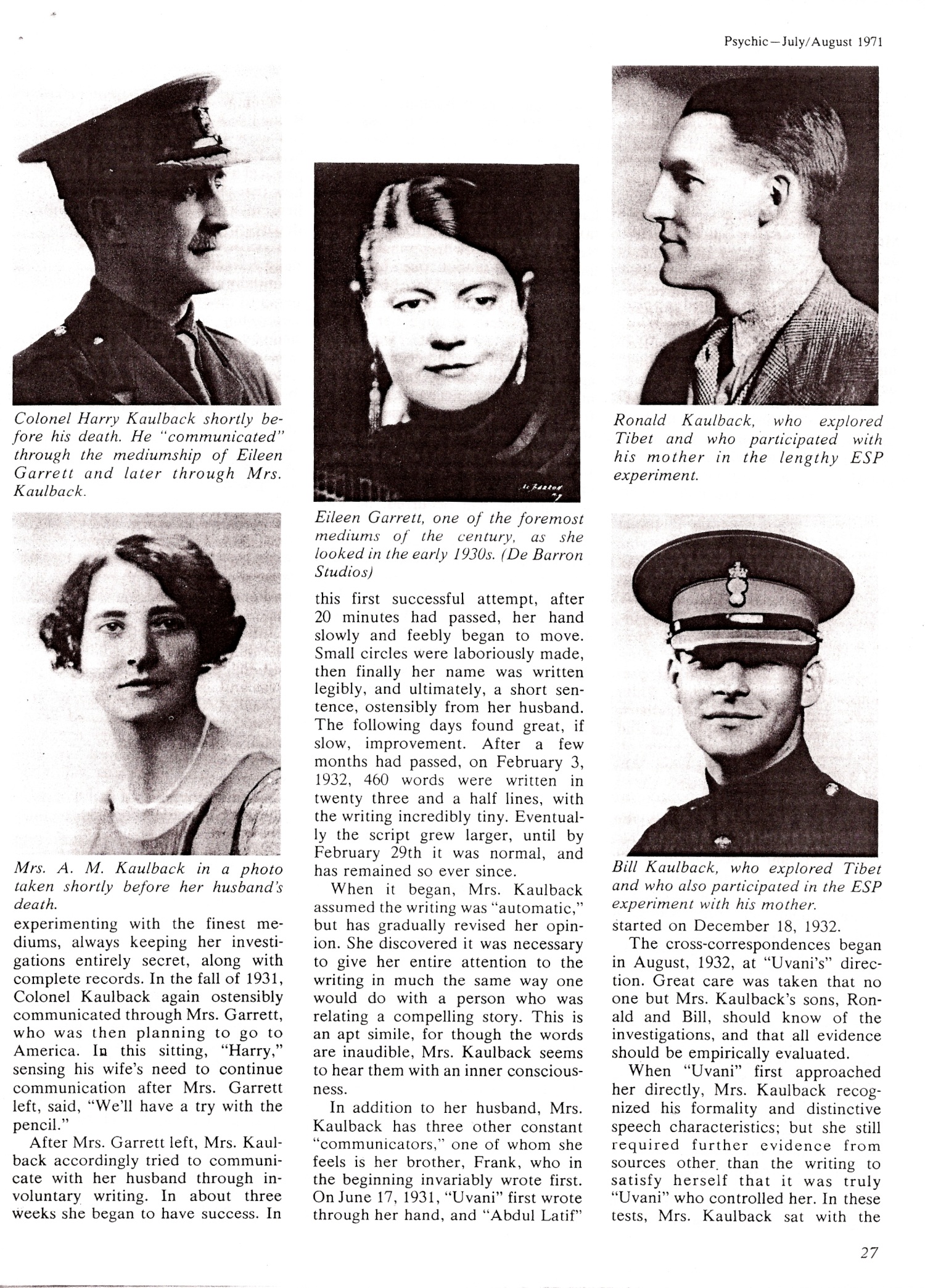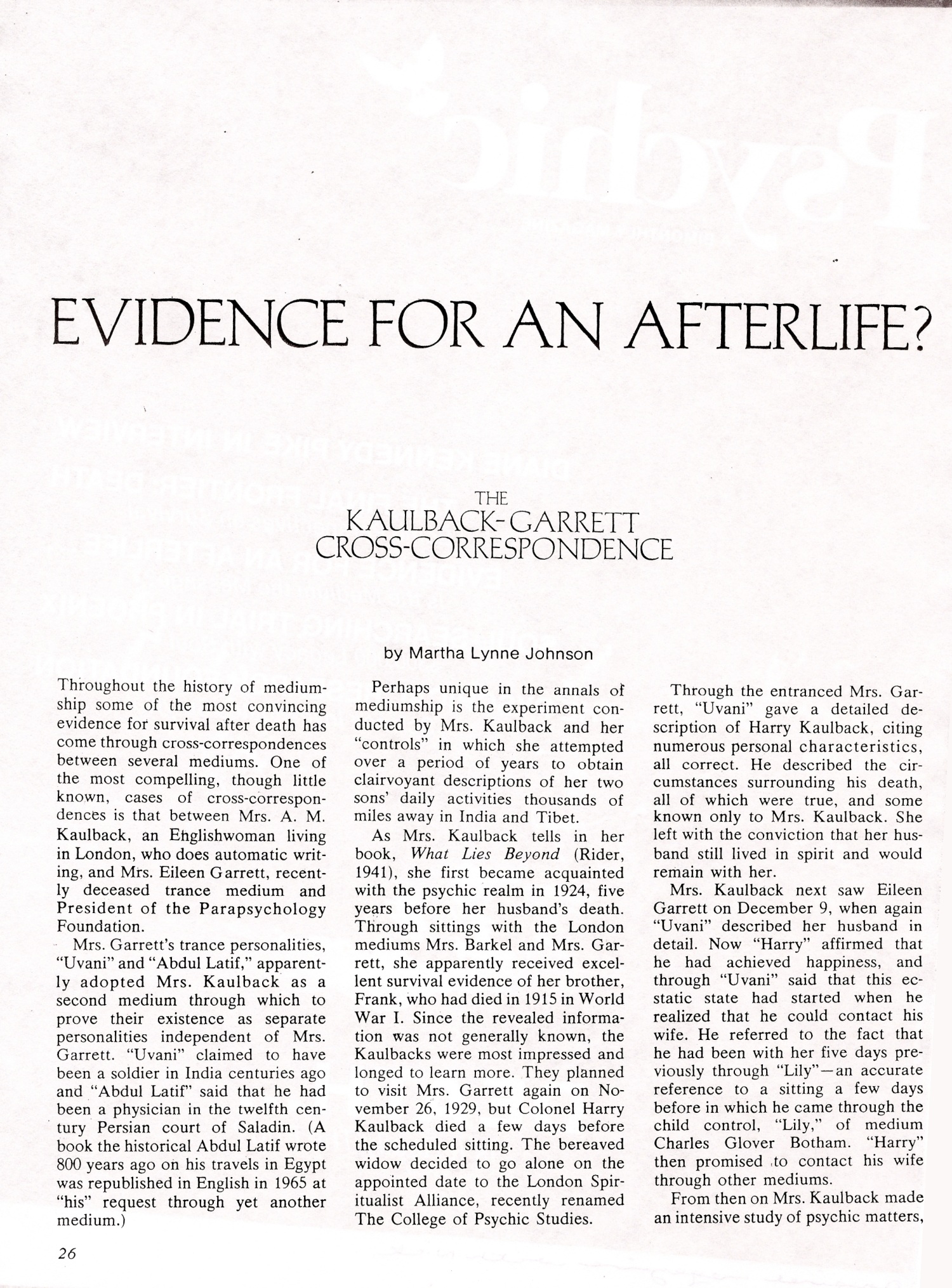 Granny K had a considerable reputation for her powers of clairvoyance and spiritualist contact. Please click on the following links in turn to view an article about her entitled Evidence for an Afterlife in the August 1971 issue of the magazine Psychic.