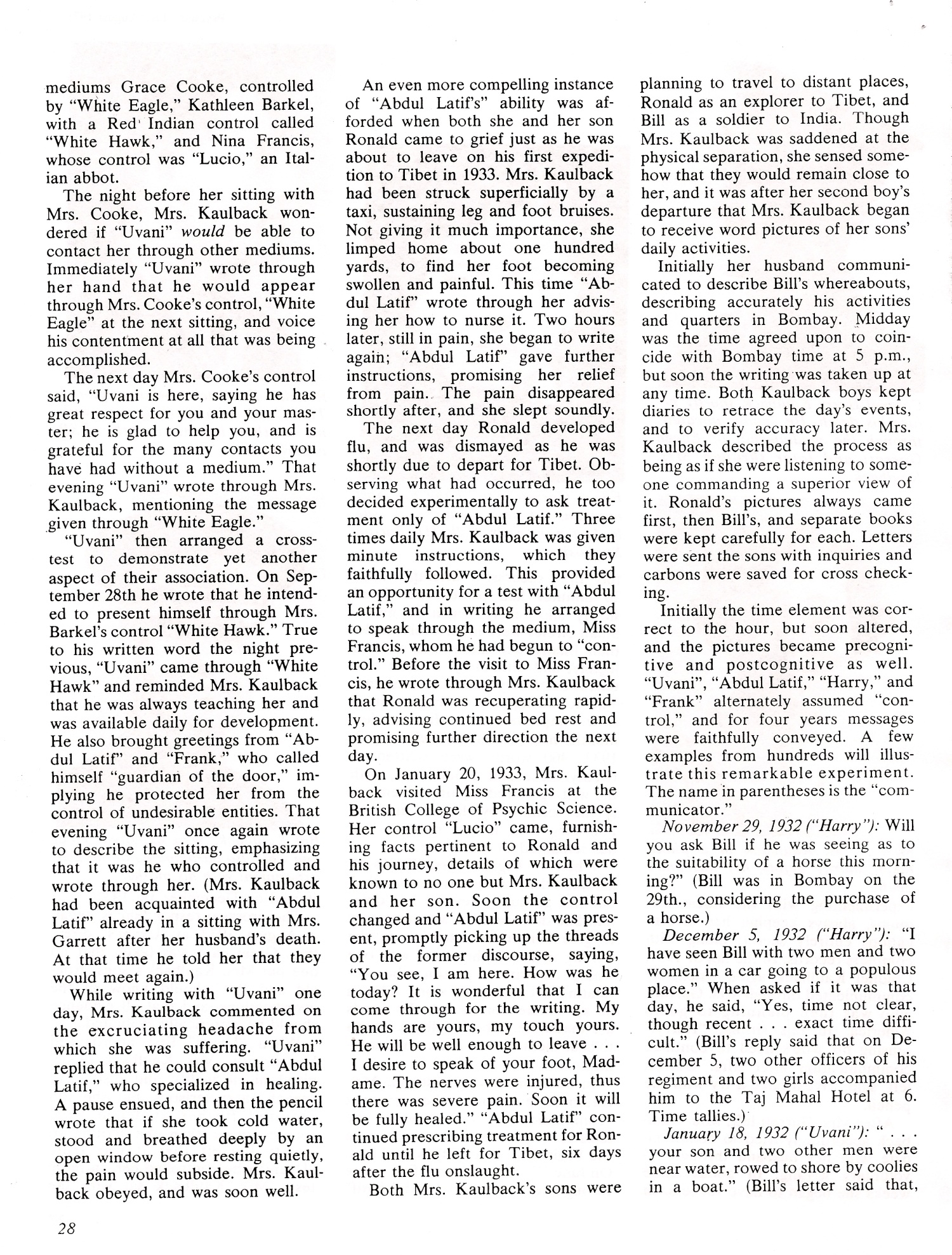 which gives a brief account of her psychic experiences arising from the deaths of her brother Frank in the First World War, and later her husband Harry, and the dangers encountered by her sons Ronald and Bill whilst travelling in desolate corners of the world.