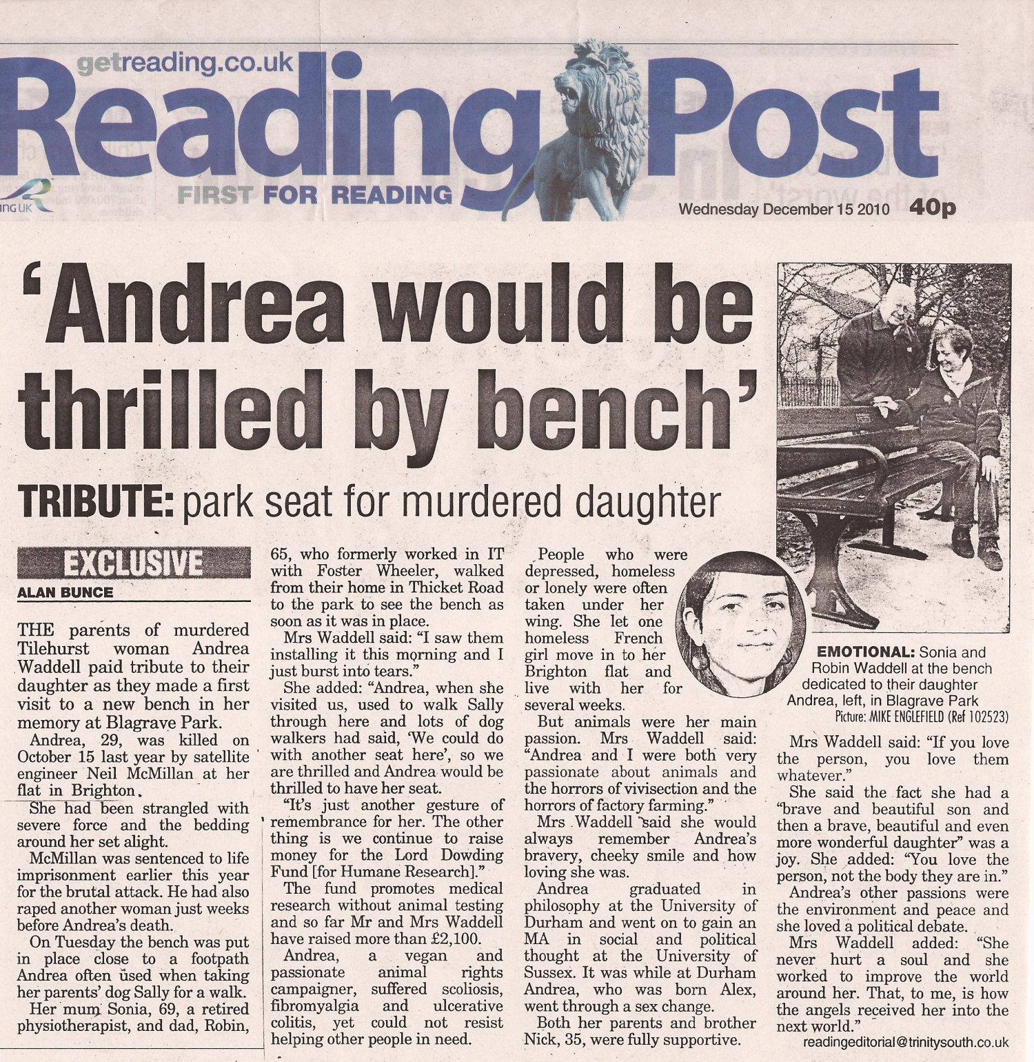Andrea's life-story is almost unbearably poignant, and it will require a great deal of reflection and resolve to put it down on paper. Her brother Nick's wonderful tribute at her Memorial Service conveys the flavour of her unique personality, and the highlights of her life, but there is of course much more besides, and my wife Sonia's tribute published in the newsletter of the Quaker Concern for Animals society touches on many of those aspects too. In due course I will try to put together something of my own special memories.