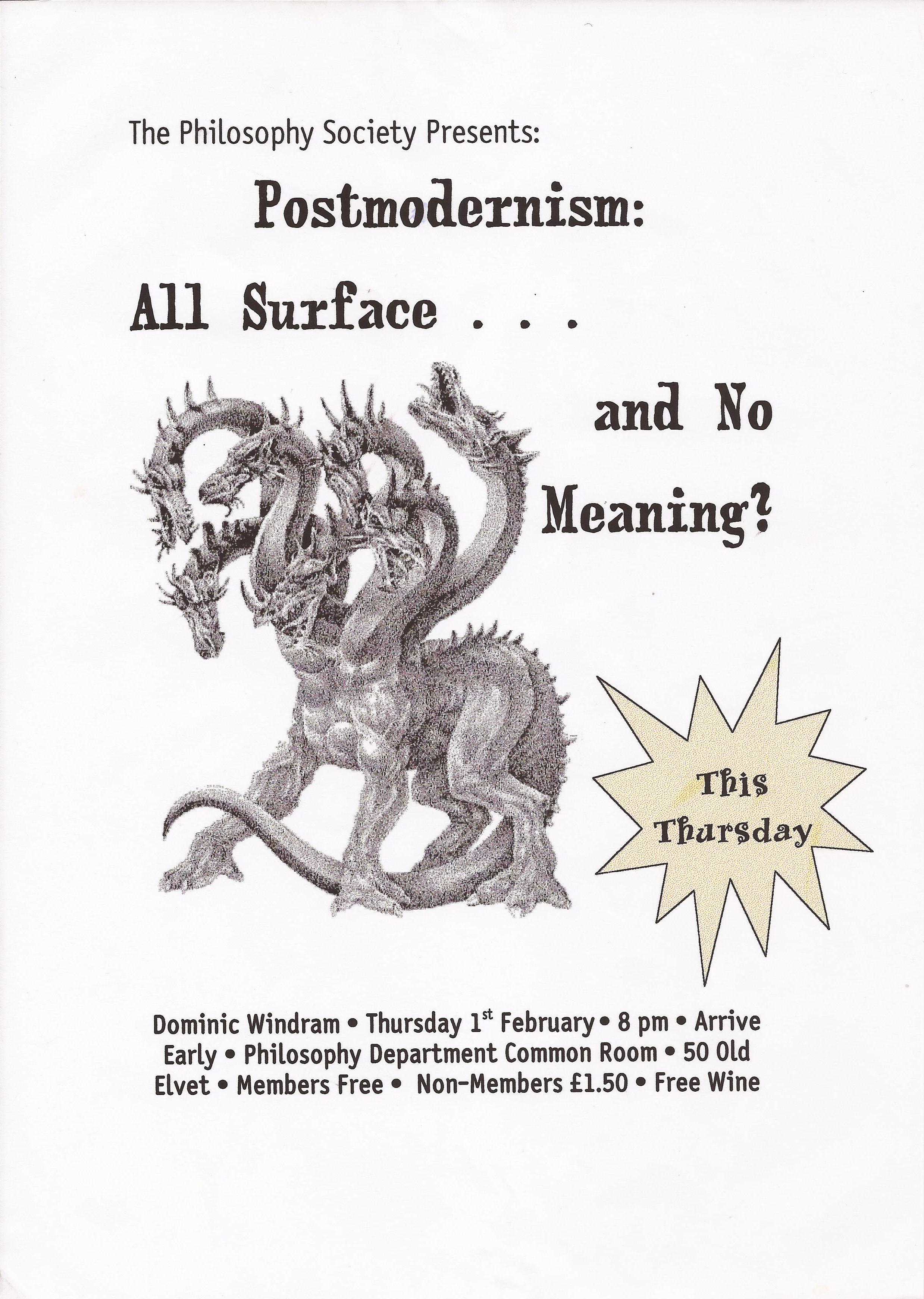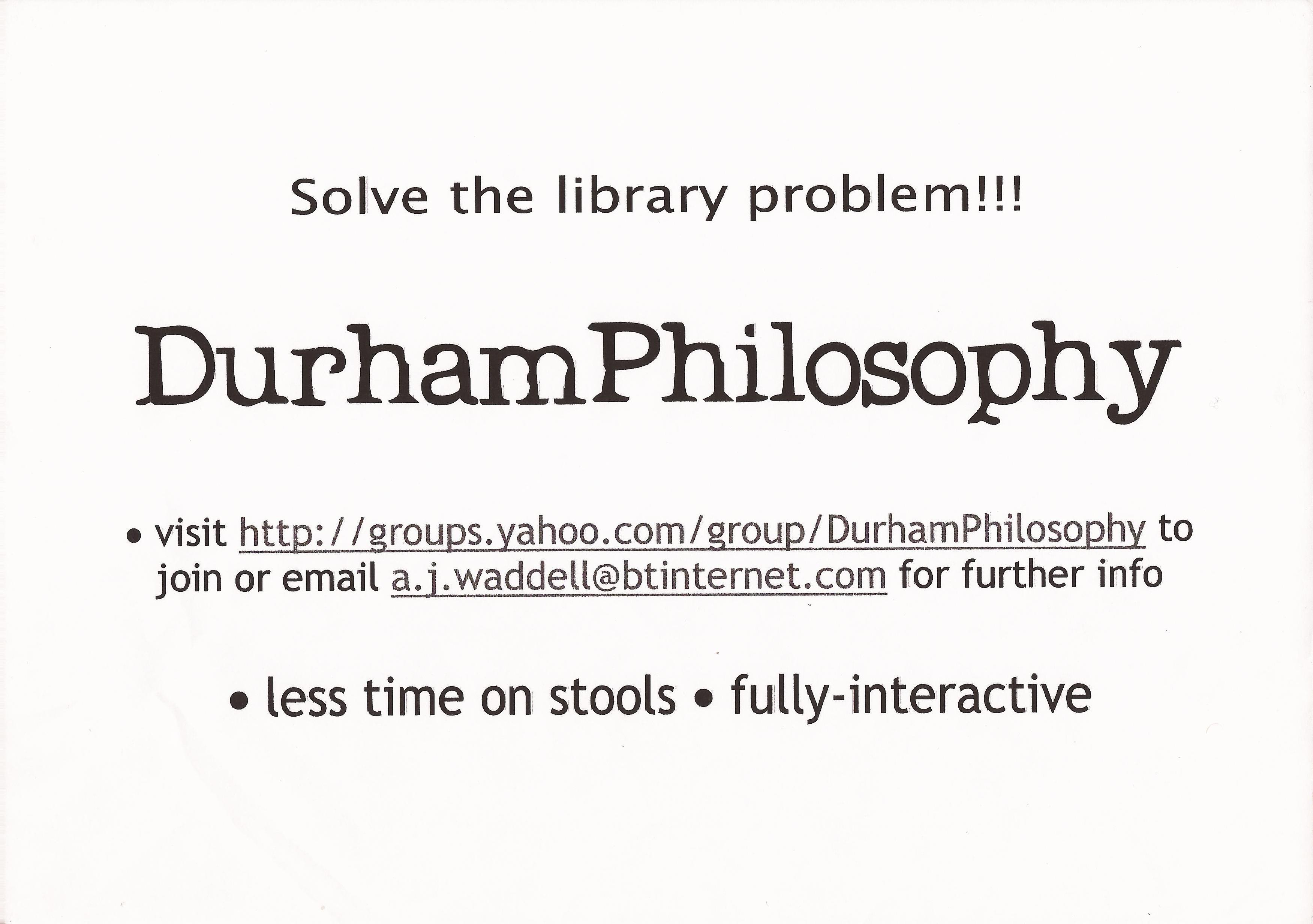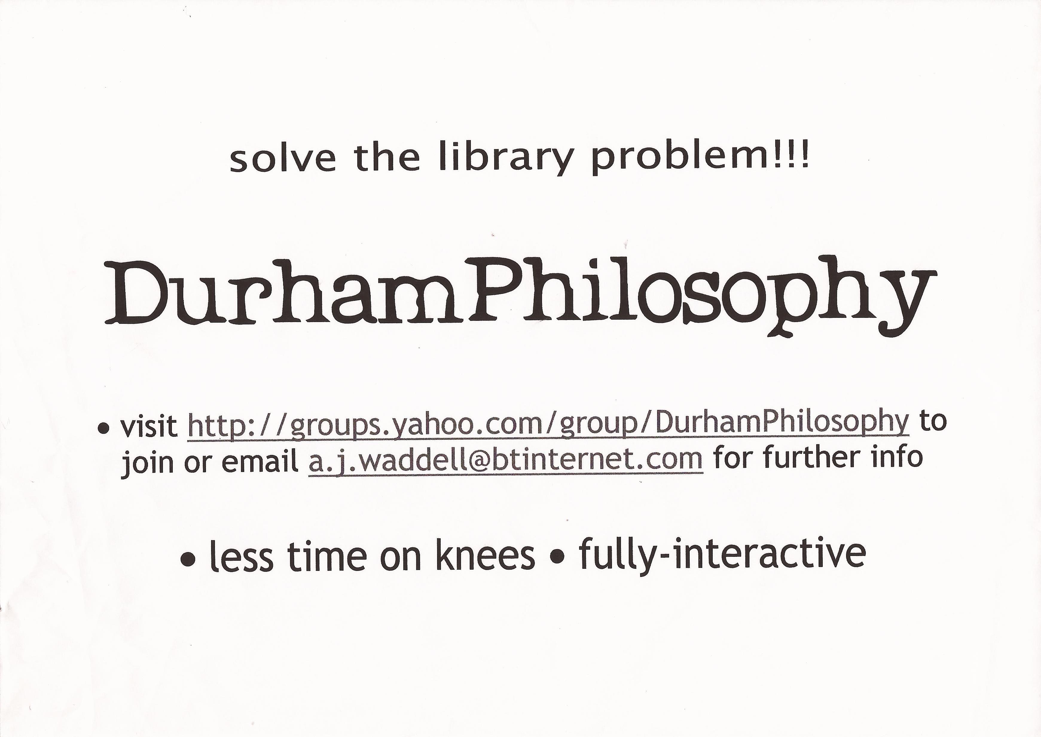 And in order to gain the attention of the earnest Seekers after Truth in the Durham student body, he increasingly fine-tuned the notice-board posters advertising such forthcoming topics and visiting speakers. He did try very hard to encourage both Tracy Emin and Davis Aaronovich to address the Durham PhilSoc, but they both said it was too far north and they might be eaten by cannibals.