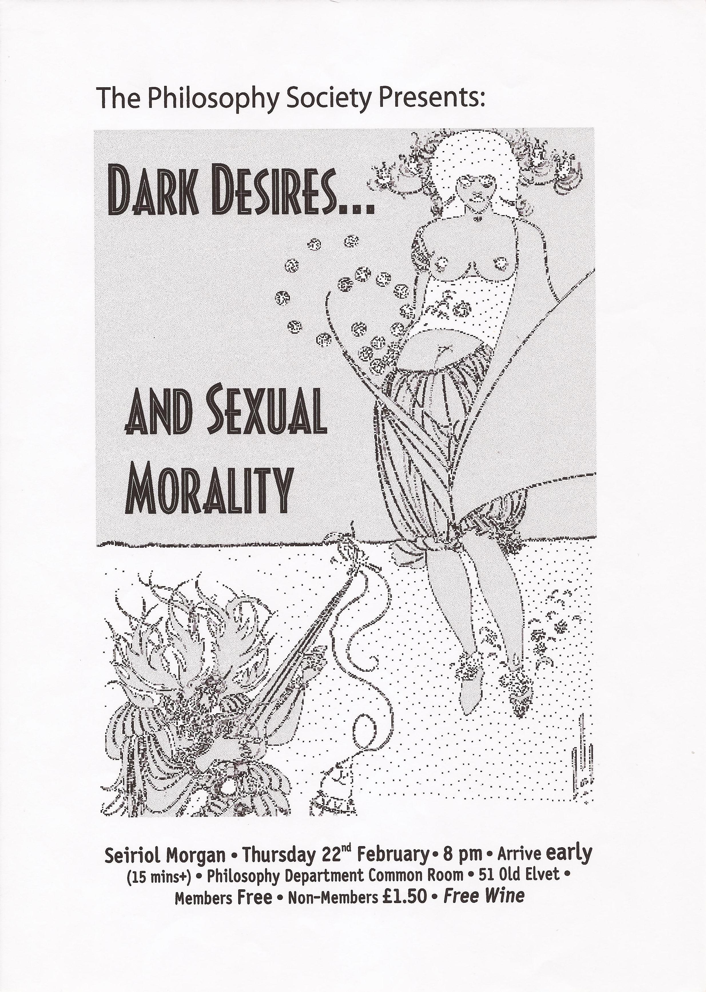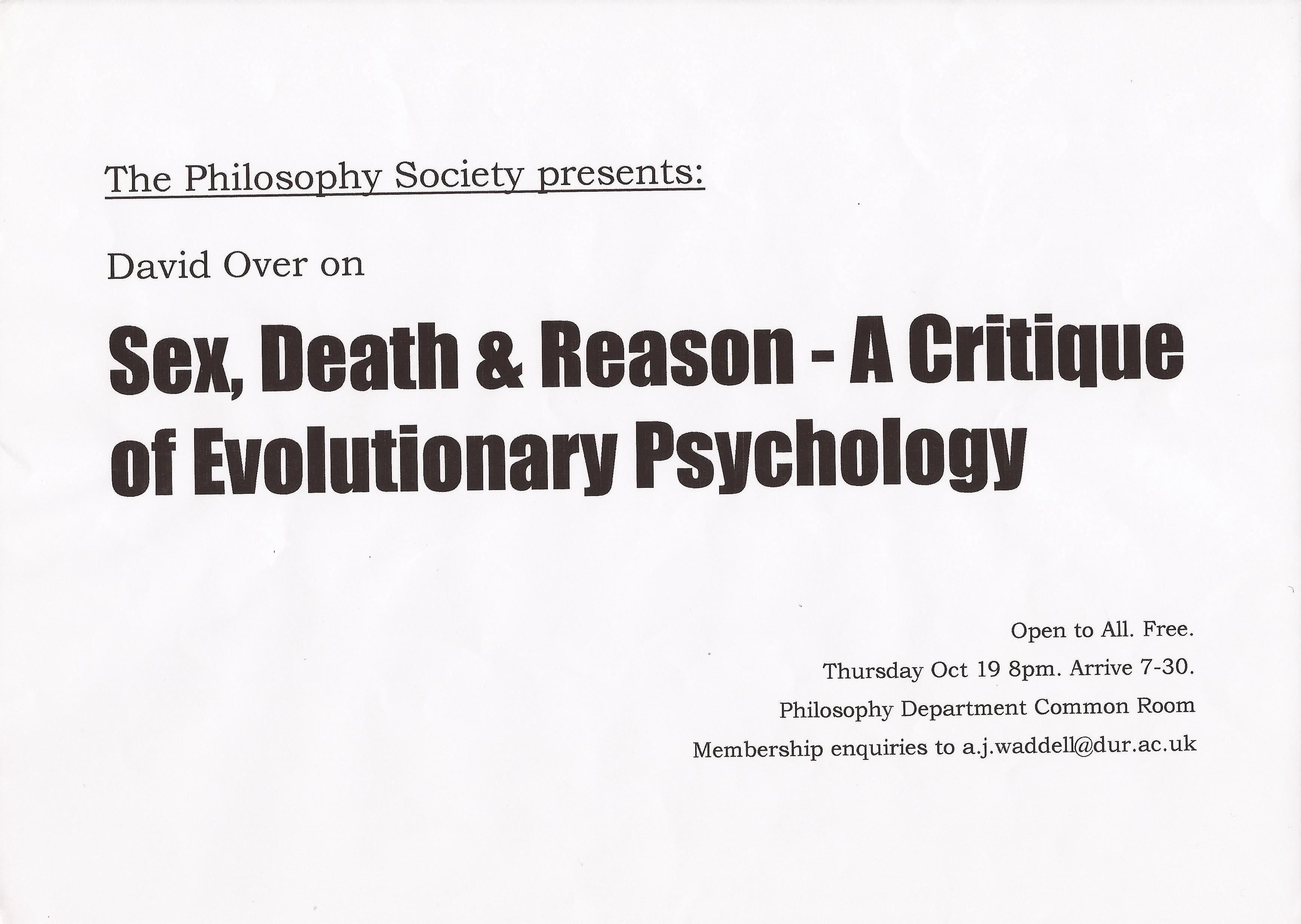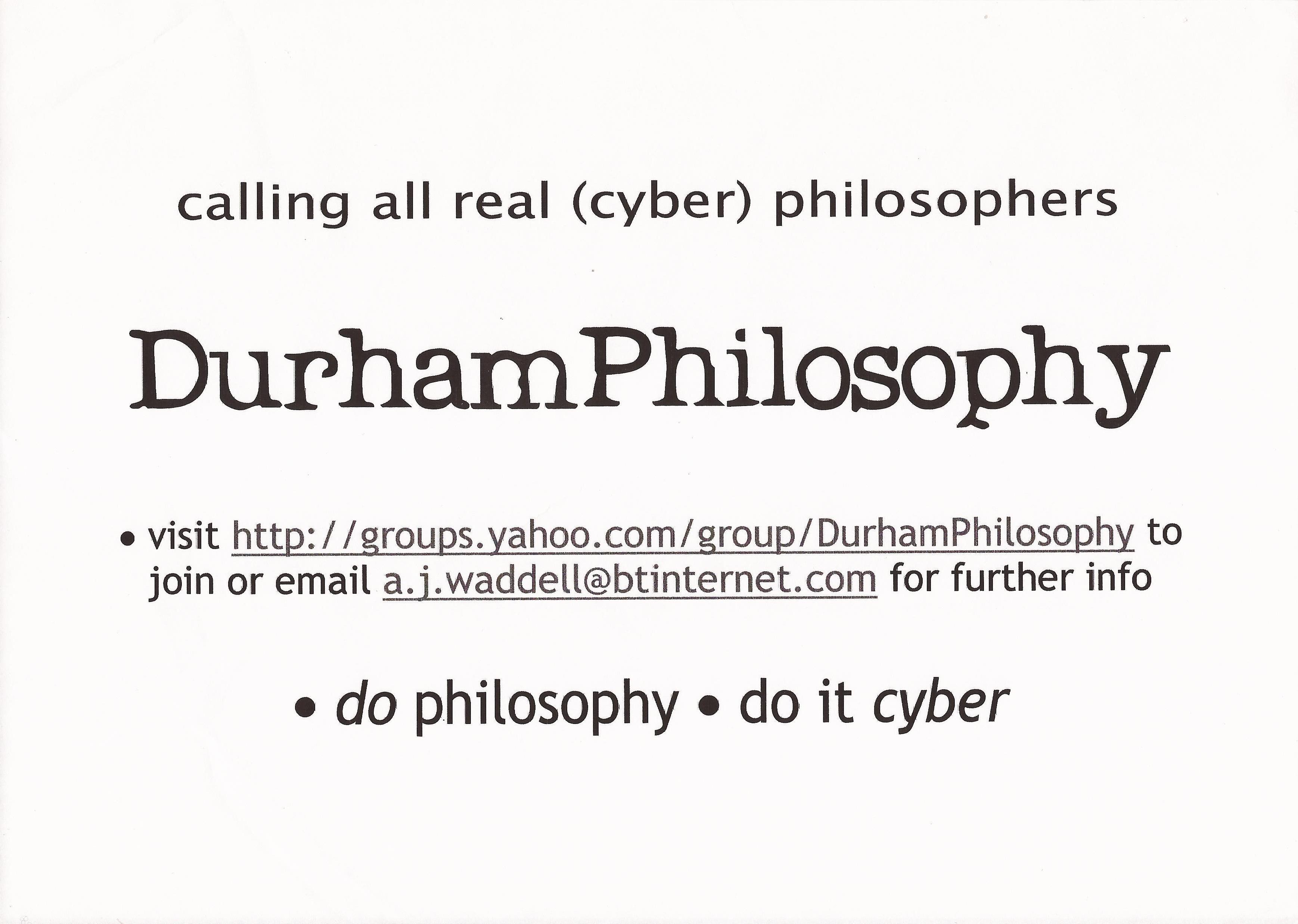 And in order to gain the attention of the earnest Seekers after Truth in the Durham student body, he increasingly fine-tuned the notice-board posters advertising such forthcoming topics and visiting speakers. He did try very hard to encourage both Tracy Emin and Davis Aaronovich to address the Durham PhilSoc, but they both said it was too far north and they might be eaten by cannibals.