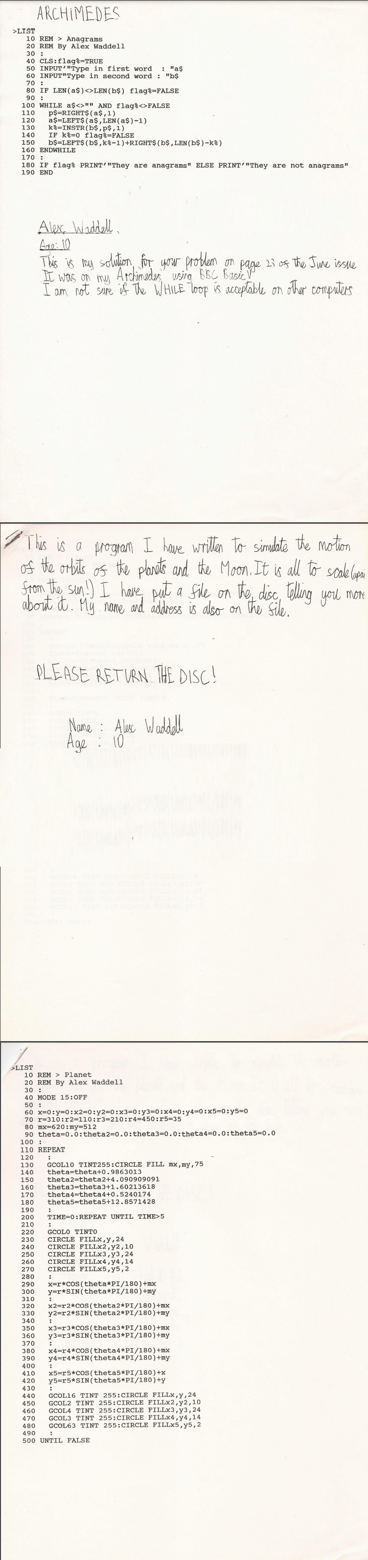 I was astonished to discover the other day (Nov 2022) a couple of the programs that Alex had produced at the age of 10 (still at primary school) as entries to competitions set in the magazine “Archimedes”. I can solemnly assure you that I provided no assistance whatsoever.
