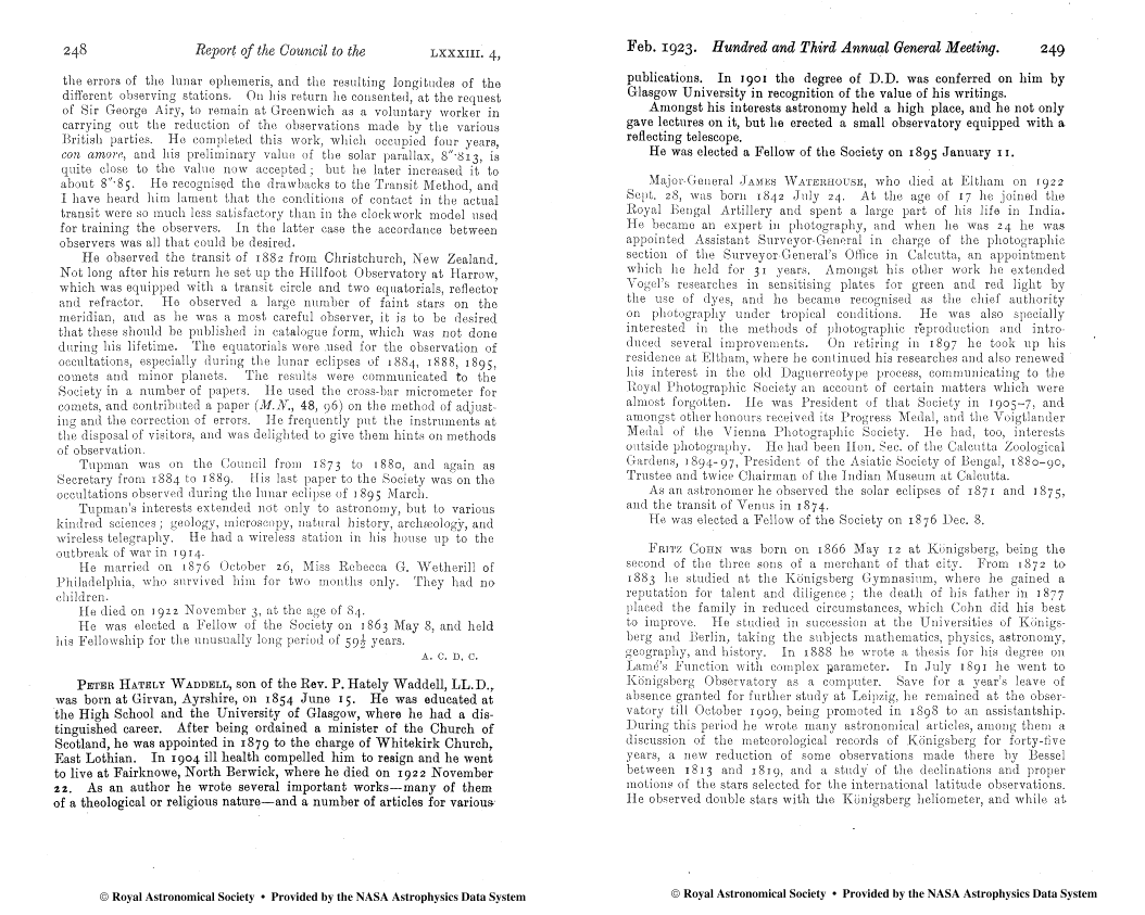 I'd like to start by reproducing a montage from two consecutive pages of the Journal of the Royal Astronomical Society, in the Obituary Section devoted to Fellows of that Society, of which he had been proposed as a Fellow in Dec 1894 and elected a month later as shown below.