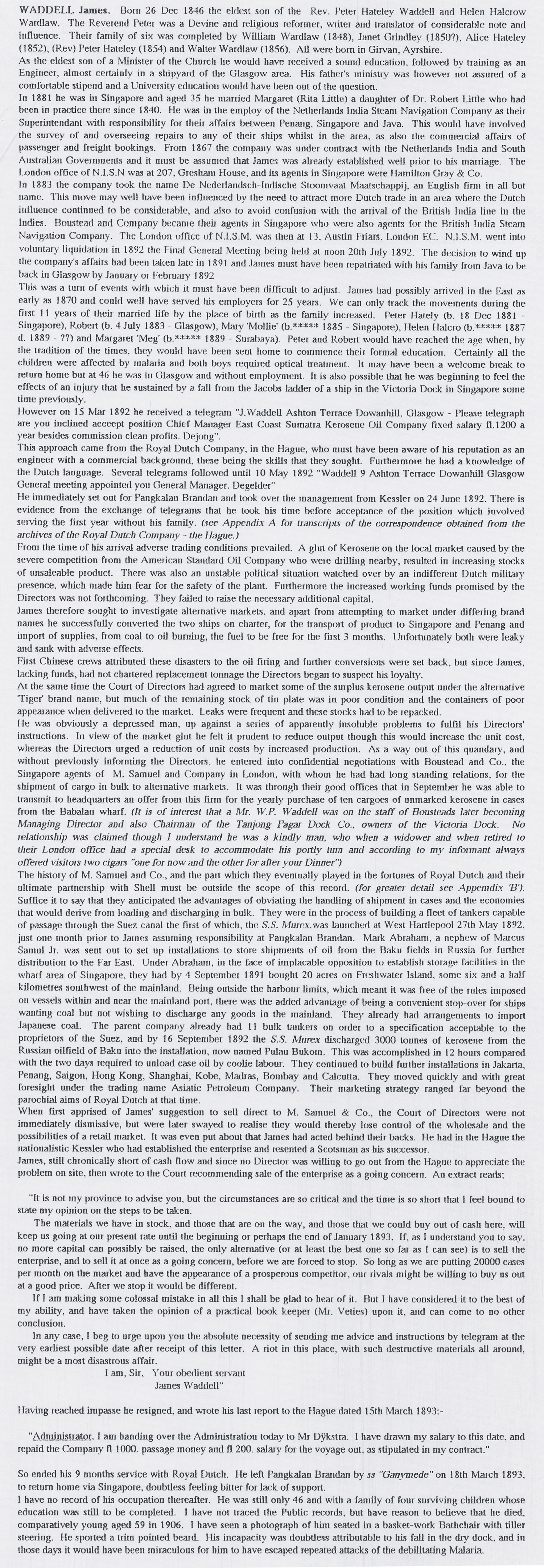 The narrative that follows is reproduced from Alexander (Sandy) Waddell's invaluable summary in his biographical document WADDELL LINE WHO'S WHO.