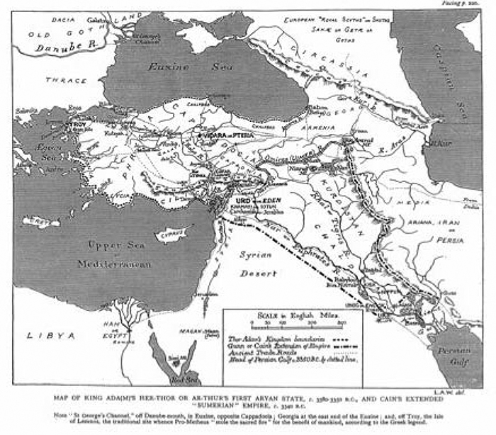 The decoded Edda discloses ancient Aryan makers of civilization (Lords, Asirs, men of Asia, Guti, or ancient Goths) taking possession of Thrace 5000 years ago, then establishing headquarters (called 'Himin' or 'Heaven') at Vidara (Pteria), Boghazkoy, in present Turkey, the home of later Hittites. These newcomers then fight a great battle in Eden as mighty armies rally from as far as Armenia under the leadership of El, or Ilu, to halt their invasion. Waddell viewed El as a powerful matriarch that had been deified during her own lifetime. In his opinion this ruler of the Old Chaldean world controlled a dragon-serpent cult and demanded blood sacrifices.