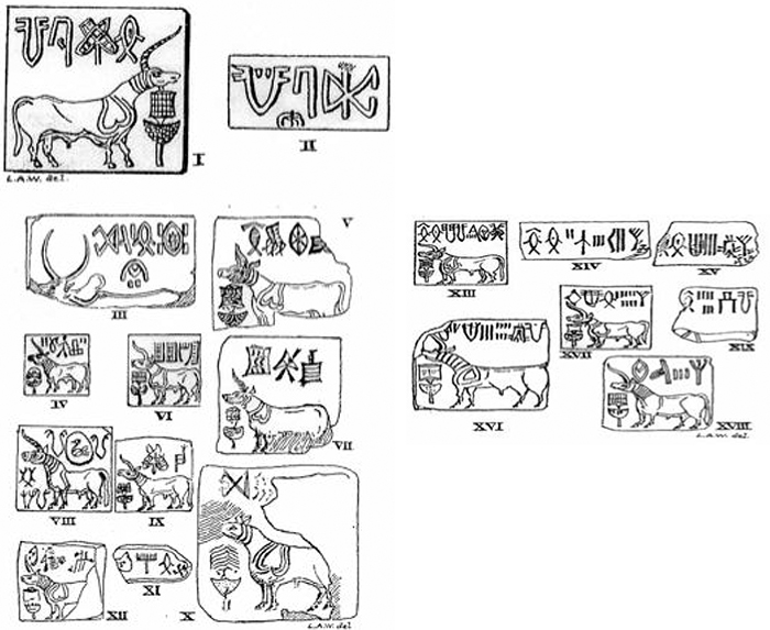 Drawing of seals: I-XII and XIII-XIX – from Indo-Sumerian Seals Deciphered. The first two signs below the head of the animal according to Waddell mean EDIN and the third LORD to indicate the owner of the seal was 'Lord of Edin.'