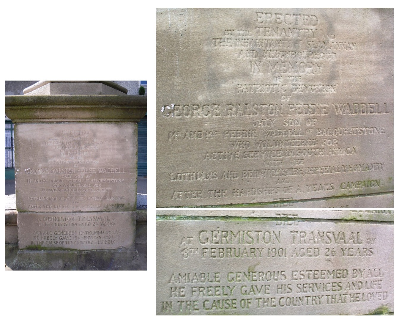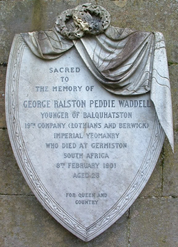 The lamentably early death of George Peddie-Waddell, killed in the Boer War, and commemorated by an ornate memorial clock-tower in the High Street of Slamannan, deprived his parents of their only son. The inscription reads as follows (click here for a close-up of the memorial tablet itself and here for its counterpart on the wall of the Waddell enclosure in the Slammanan kirkyard):