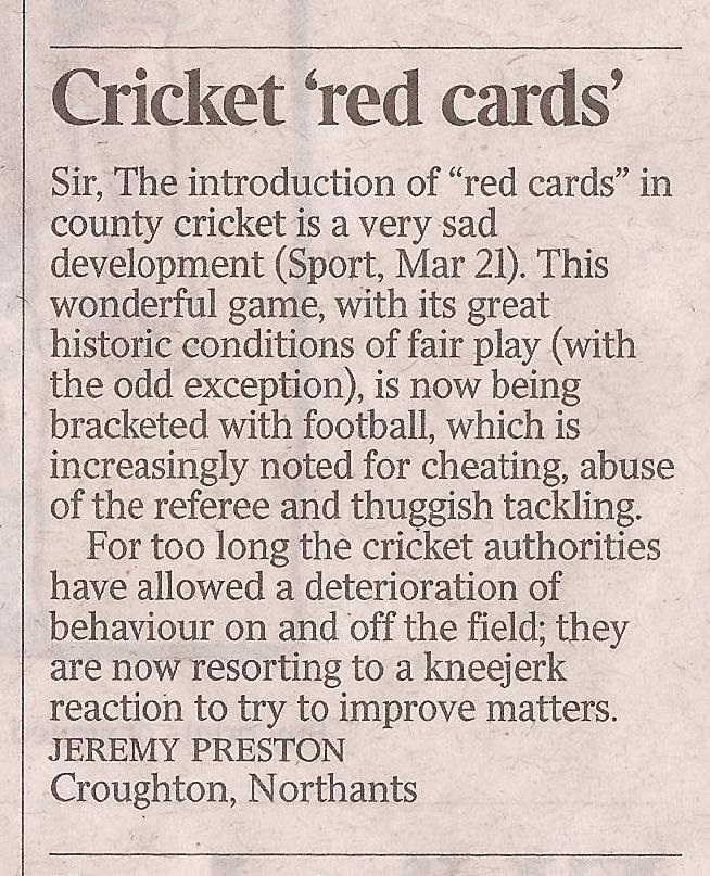 It is of course undeniable that standards have plunged, ever since the English introduction of bodyline bowling back in their Australian tour of 1932/3 and the more recent Australian recourse to sledging. However, who could object to the placard held up opposite the Australian all-rounder (and notorious ladies' man) Shane Warne as he was bowling against England a few years back, "Shane I think I'm pregnant"?