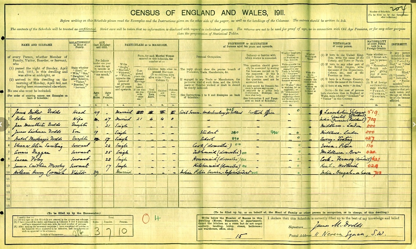 Frances Jean Macalister Dodds (27 Mar 1890 – 20 Oct 1978) James Leishman Dodds (5 May 1891 – 13 Aug 1972) Helen Isobel Mackenzie Dodds (b ca 1894) Edward Anthony Charles Dodds (b 12 Mar 1898) |
