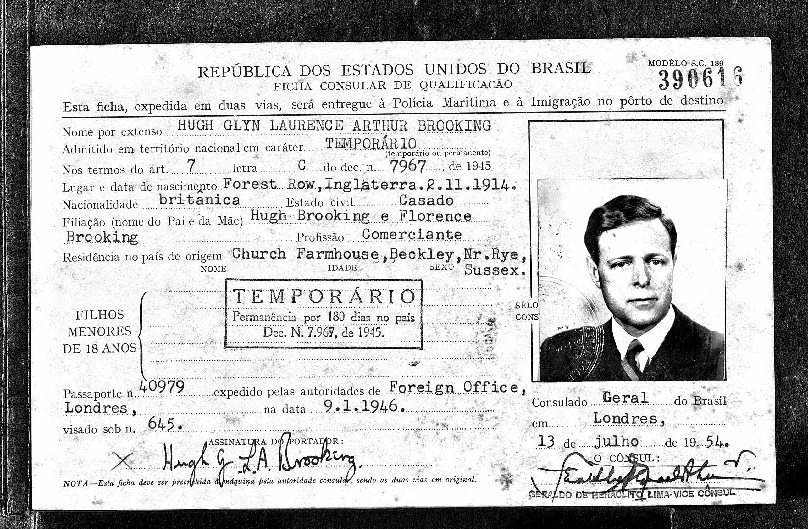 Sqn Ldr Hugh Glyn Laurence Arthur Brooking (2 Nov 1914 – May 2000) (m 1949) (King's Messenger) Portrait younger son of Hugh Cyril Arthur Brooking (15 Sep 1870 – 31 May 1918) and Florence Eugenie Day elder brother (b 1912) was Granville Reginald Arthur Brooking |