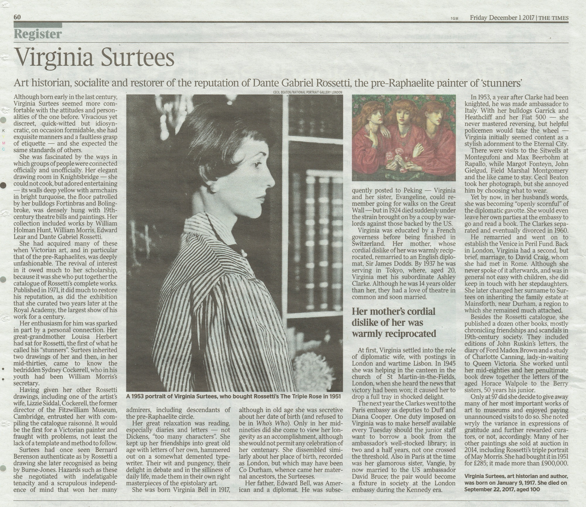 (9 Jan 1917 – 22 Sep 2017) Portrait ultimately redevenue Virginia Surtees as a cultural ingenu myself, she irresistibly reminds me of Saki's Francesca Bassington though I have always and uncritically loved the Pre-Raphaelites ever since I saw Burne-Jones' King Cophetua and the Beggarmaid at an early age, but now I've seen Leighton's version I hugely prefer the looks of his maid. I'm an irredeemably testosterone-driven low-brow as regards the visual arts. Perhaps that's more honourable than judging them simply by auction-value. The finest artistic creation of all time for me is Leonardo's cartoon of The Virgin and Child with Saint Anne and John the Baptist. Nothing else comes even close. OMG, perhaps I fancy the BVM – I'm headed for the pit of boiling sulphur. |
