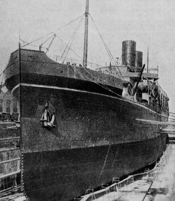 Her keel was soon laid down in Yard number 327, but amazingly, she remained a ship without a name although it was thought by many that she would be named "Taj Mahal," but that was not to be! As her hull and part of her superstructure had been completed, she was launched on June 28, 1914 by a Miss Edith Cole yet she remained without a name, thus the unnamed ship was taken to her fit-out berth for completion.