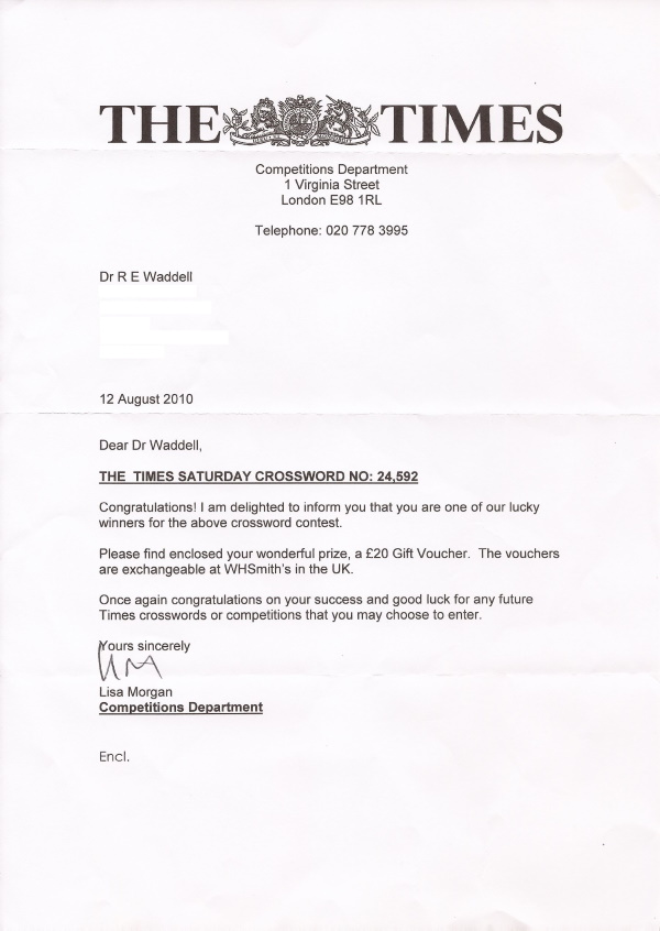 So what benefits accrue? Very occasionally: in my case only thrice have I been one of the lucky weekly winners in the Times weekly cryptic, and twice in the Independent, so in sixty years I've scooped £100 in gift-tokens. And as you can see [Jan 2020], it's been a barren decade since the previous bonanza ...
