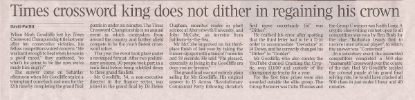And although the feats of the truly stellar crossworders who take part in the Times Crossword Championships1, 2 every year are way beyond the reach of us honest plodders, at least we're all on the same track – but just that they're much quicker – rather like we're way back in the pack of the London Marathon while the Kipchoge's battle for top place.