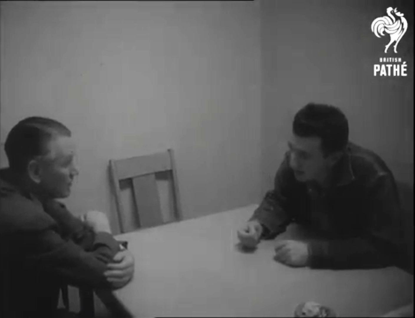 Interior M/S prisoner Caryl Chessman being interviewed by pressmen at a conference. Various shots of Chessman being interviewed. C/U of him smoking. Various shots of him, camera pans across journalists. Exterior of the main prison buildings. L/S buildings showing the gas chamber at the far end of an alley next to condemned row. M/S interior Chessman giving one of his last interviews to Ralph Champion of the 'Daily Mirror' one to one. Various shots of the interview. M/S as Chessman and Champion stand up and shake hands. C/U Chessman.