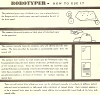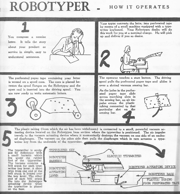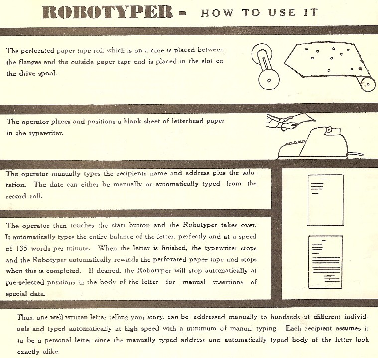 Other automatic typewriters included the Robotyper, which was introduced in 1935, and the Flexowriter, which was introduced in the early 1940s. The Robotyper was pneumatic and used paper rolls. According to a 1951 ad by the Robotyper Corp., Hendersonville, NC, "Operating four Robotypers, one girl can produce from 600 to 800 perfectly typed, personalized letters in an 8-hour day." (See photo top right.) Robotyper introduced the Carlson Selector (see photo bottom right) in 1951 for answering letters using paragraph stored on punched cards. "The executive determines from a list of predetermined paragraphs" the ones that will properly answer each letter. The operator could also use the Carlson as a conventional manual typewriter.