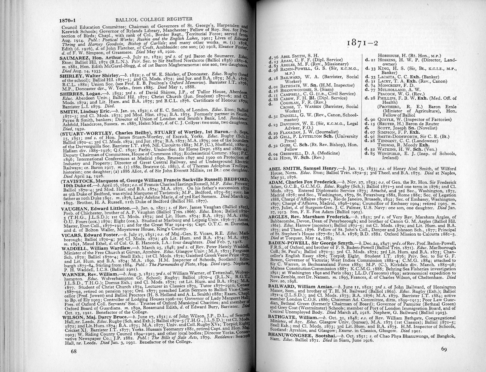 Addison 1727-1897 reads: HM Inspector of Schools; Snell Exhibitioner, 1870; BA Oxon 1874