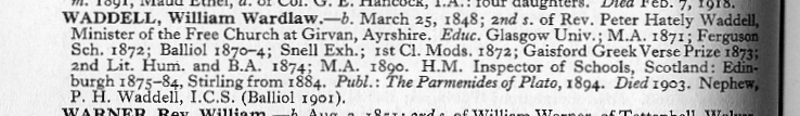 Born at Girvan, Ayrshire, 25th March, 1848. Second son of the Rev. Peter Hately Waddell (son of James Waddell of Balquhatston, Stirlingshire), and Helen Halcro Wardlaw (niece of the Rev. Ralph Wardlaw, D.D., of the Congregational Church), descended from the Rev. Ebenezer Erskine through his grand-daughter, Ann Fisher.