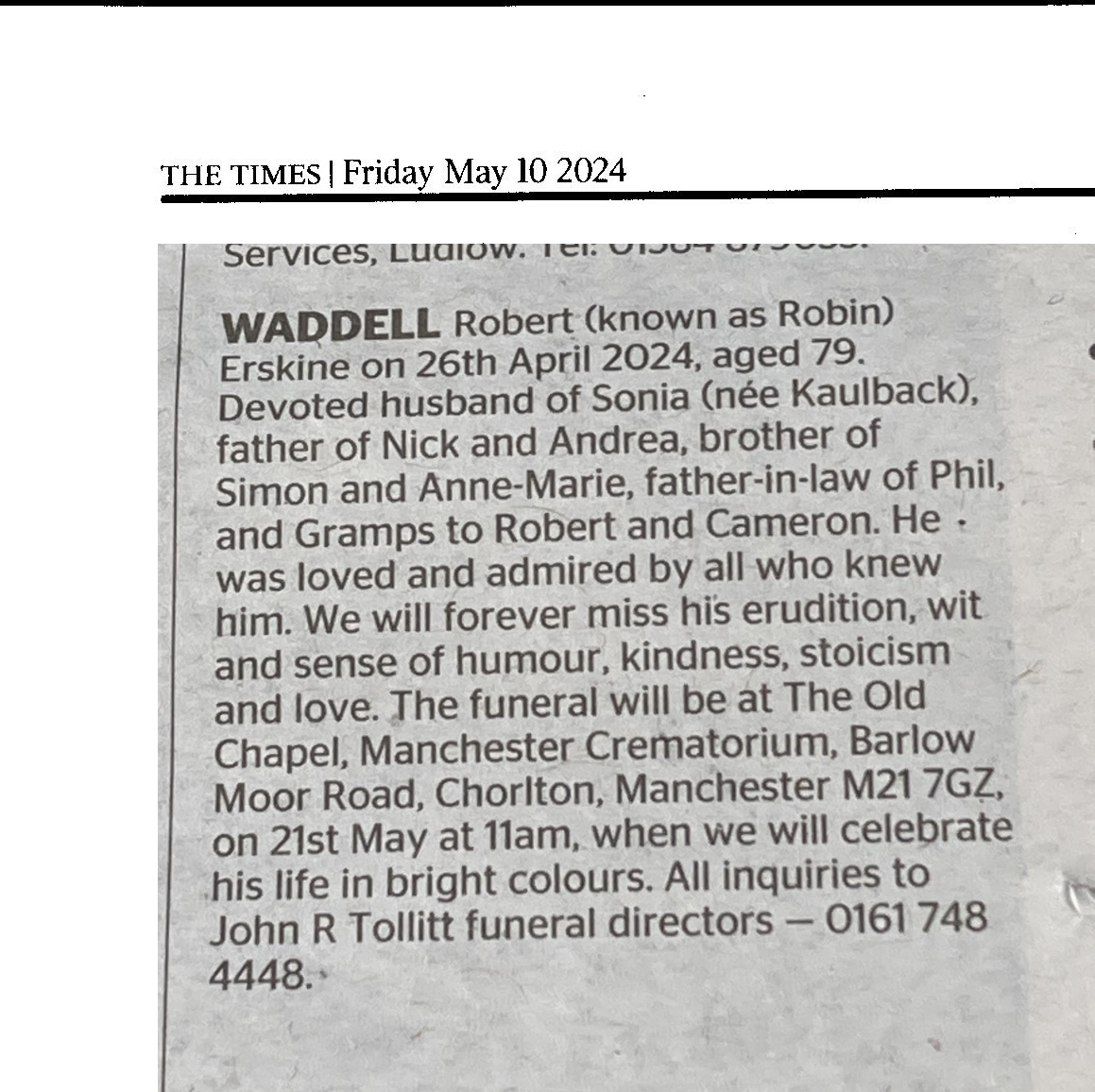 | 0 | Robert (Robin) Erskine Waddell (11 Feb 1945 – 26 Apr 2024) The Times announcement |