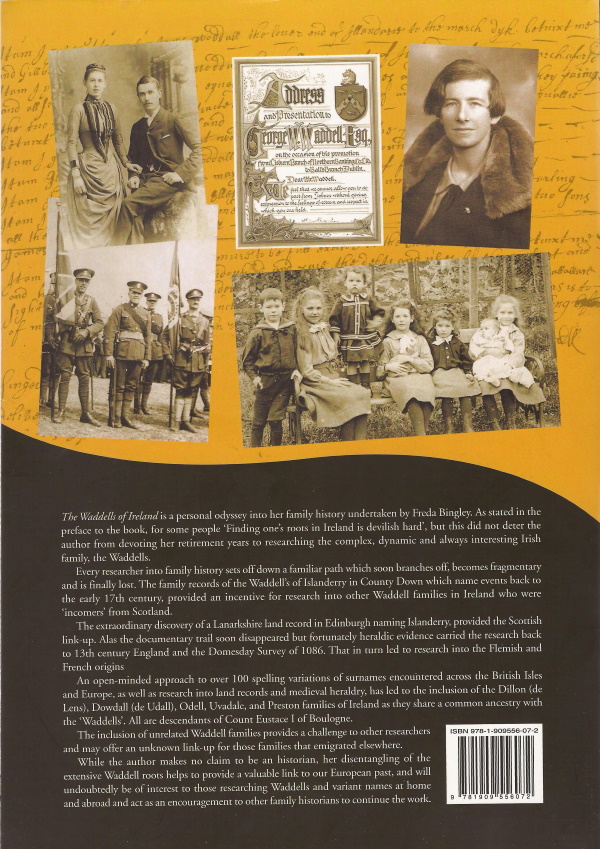 With only a very basic primary education, though with extraordinary powers of retention and assimilation, and starting from scratch in middle age, Freda decided to investigate the origins and history of the surname Waddell (or similar), principally in Ireland, but also from its roots in Scotland.