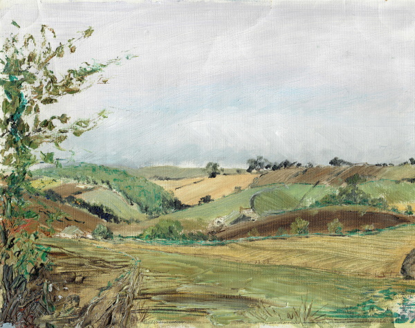 Freda never wasted time with elaborate preparations, and on a Campervan trip through the Cotswolds one day, they had parked for a while in a layby at the top of Fish Hill, overlooking the village of Broadway, often described as the Jewel of the Cotswolds. So while Keith pottered around brewing up some tea, Freda got out her painting materials, set up the easel, and got to work on an impromptu picture. But eschewing the conventional prettiness of the village itself, Freda’s subject was the undulating landscape in quite a different direction.