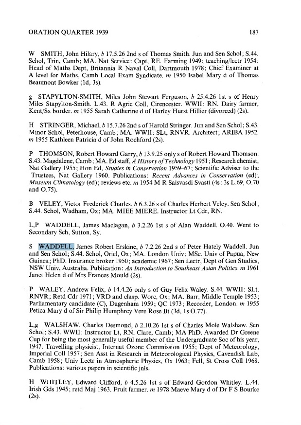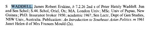 His career thereafter did indeed gravitate towards Southeast Easia, the very area in which his grandfather James Waddell had made his liveliood, and he eventually became a Senior Lecturer in the Department of General Studies at the University of New South Wales in Sydney.