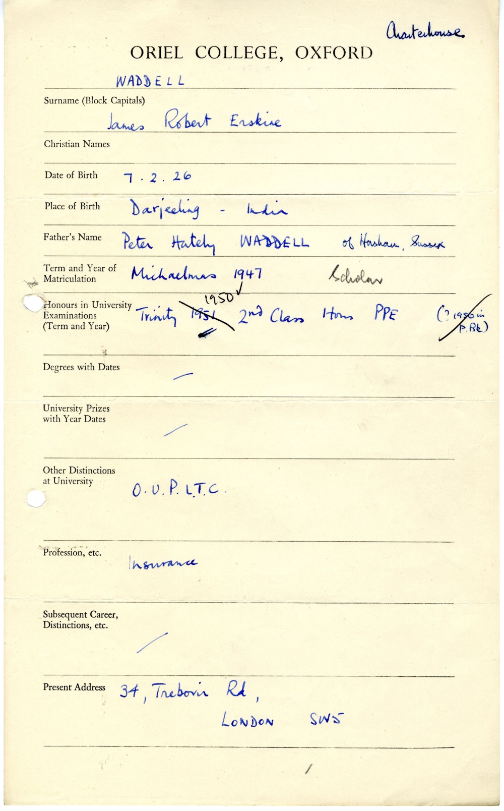 James Robert Erskine Waddell (7 Feb 1926 – 28 Jun 2007) Saunderites OQ1939 – SQ1944, School Monitor, 3rd XI Cricket, Charterhouse Benn Scholarship to Oriel College, Oxford