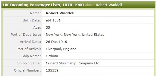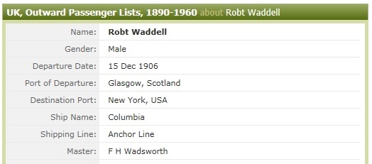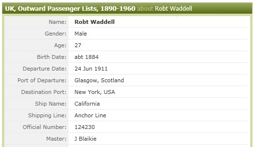There are two individuals by the name of Robert Waddell, categorised as Engineer, and with approximately the right age, both starting from Glasgow, both heading for New York. One was in late 1906 (possibly him, but the details supplied on the US Passenger List are drastically different), the other in mid 1911 (definitely him, from the corroborative details supplied on the US Passenger List).