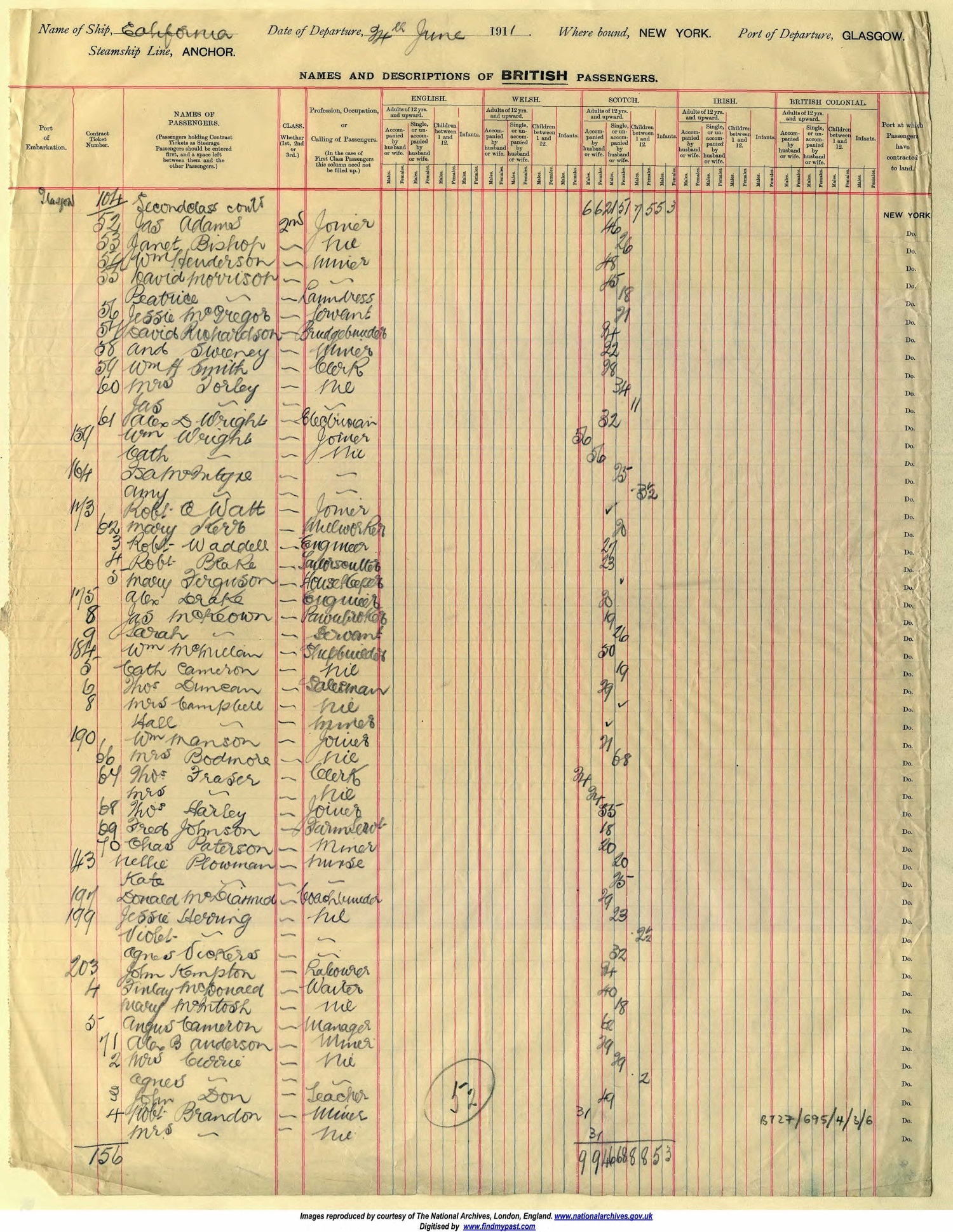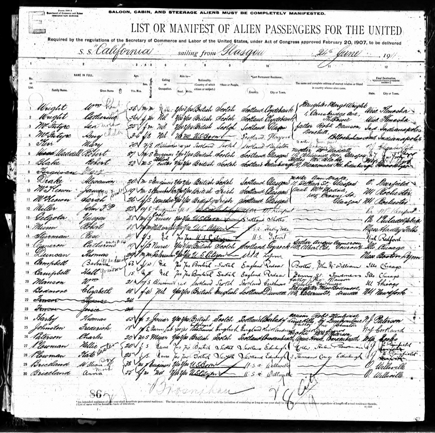 At the time he put that to paper it would have been a Herculean task to check the Passenger Lists of all passenger liners, of both UK and US shipping companies, leaving the various principal ports (Glasgow, Liverpool and Southampton) of Britain for America, over a period of time encompassing the date of 1908.