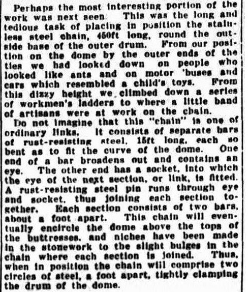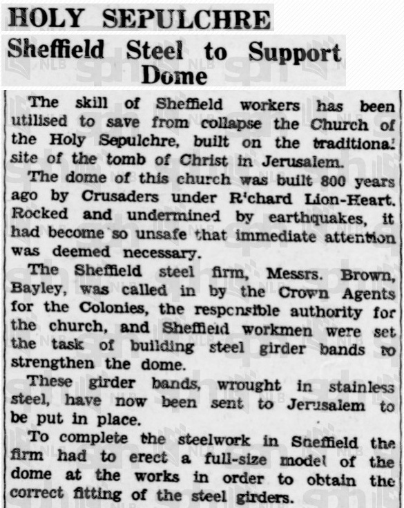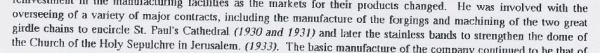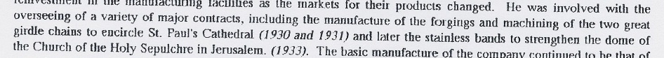 So began his association with the company which he served until early 1937. During that time there was an extensive reinvestment in the manufacturing facilities as the markets for their products changed. He was involved with the overseeing of a variety of major contracts, including the manufacture of the forgings and machining of the two great girdle chains to encircle St. Paul's Cathedral (1930 and 1931) and later the stainless bands to strengthen the dome of the Church of the Holy Sepulchre in Jerusalem (1933). The basic manufacture of the company continued to be that of tyres for rolling stock and ever more sophisticated steels in billet form for steel product manufacturers. He had perforce much to learn of metallurgy and the steel making processes as well as the management of the plant and workforce. Every aspect was new to him and the abruptness of the Yorkshire people he would be encountering for the first time, yet by 1927 he was awarded a prize for a paper delivered in Heat Treatment. He visited Germany around 1934 in connection with the licence agreement from Krupps they held for the manufacture of austenitic steels and in 1935 visited several plants in America.