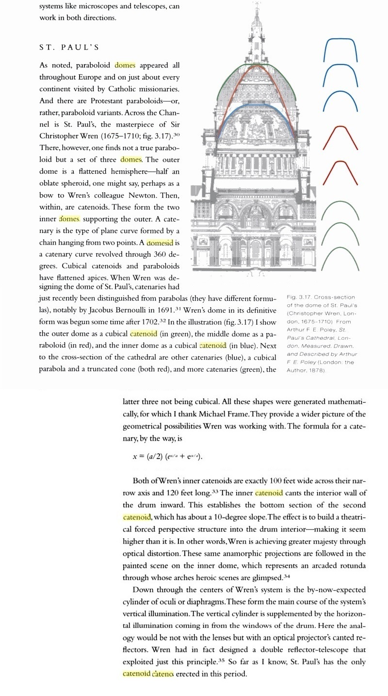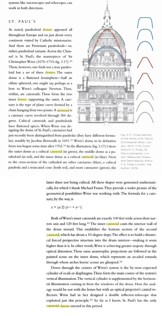 He doesn't explain the meanings or algebra of conicoids, cubical paraboloids or cubical catenoids, and I feel more confused rather than less, except insofar as Hersey has sort of confirmed that it was on the middle and inner domes that Hooke and Wren focussed their efforts to simulate the catenary profile.