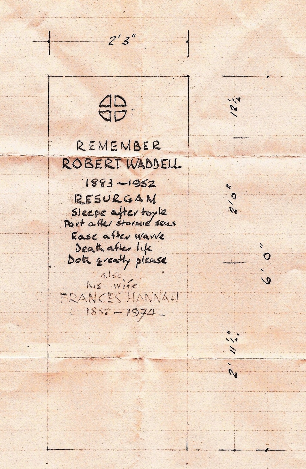Robert was buried in the graveyard of Fishbourne's Church of St Peter and St Mary, just across the fields from Elm Lodge, with a headstone inscribed simply Robert Waddell, 1883 – 1952. I noticed it every time I was taken to Matins by Hannah (Grannie) or by Aunt Jane, though it was never pointed out. It was intriguing of course, the same name as myself though with no nasty "Erskine" in the middle.