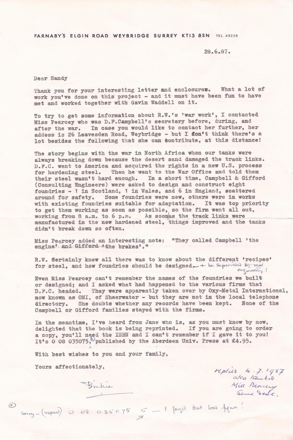 Unfortunately Sandy's earlier letter and the material he enclosed haven't come to light. But the references to tank-tracks and the urgent need for facilities to produce super-hardened steel proof against the depredation of North African sand fit in perfectly with the involvement of both Robert (click here) and indeed his son Walter (click here) with this issue.