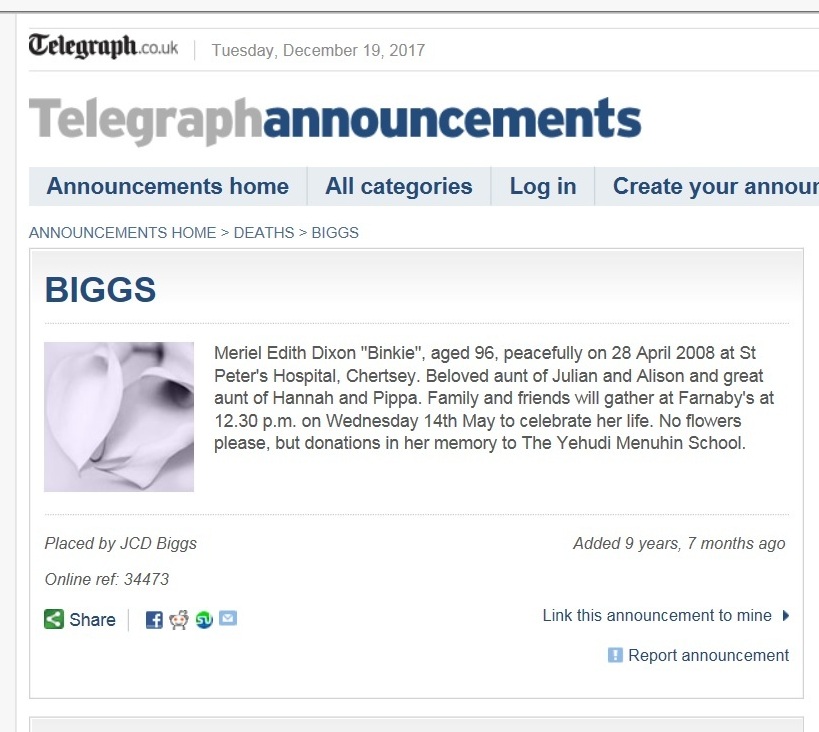 aka Farnabys (nb omission of discreetly omitted tricky apostrophe – she would have been much amused), Elgin Road, Weybridge KT13 8SN (5 bedrooms, 3 bathrooms, 4 reception rooms, price estimate £1.64 million (she would have been horrified).