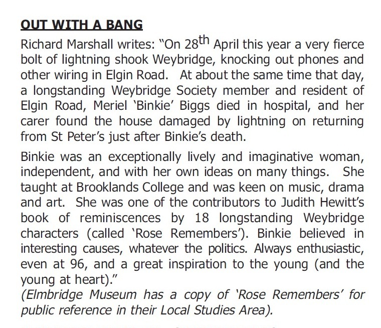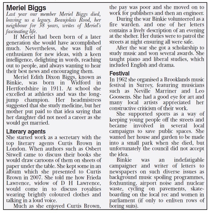 Last year our member Meriel Biggs died, leaving us a legacy. Beaujolais Rood [there's a name to savour], her neighbour for 38 years, writes of Meriel's fascinating life.