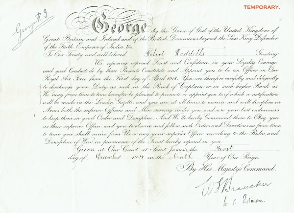 Commission as Captain (sic) in RAF,