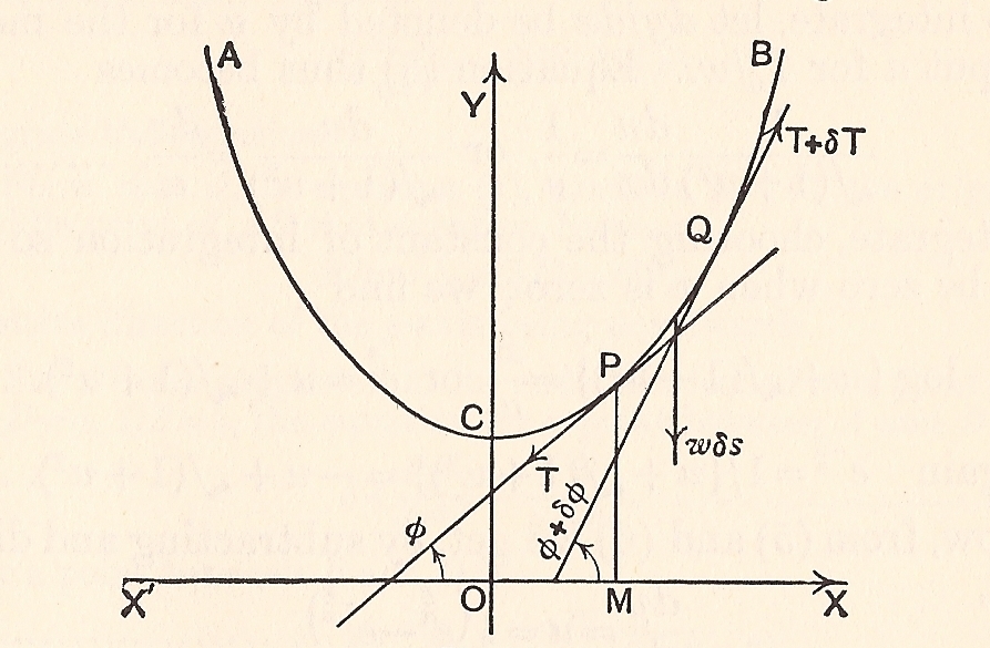 Curve ACB is the catenary of course, A and B being the suspension points. The chain is assumed to be uniform, with a linear density (ie weight per unit length) of w. PQ represents a typical small section of the chain, of length δs and mass w δs.