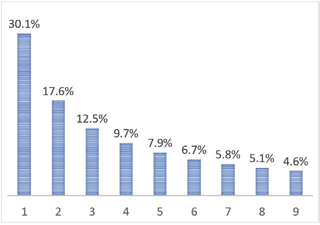 Indeed, he devised an inspired formula to quantify the relative frequencies of the initial digits of the numbers in the antilogarithm table. It gave the probability of a real-world number beginning with the digit d as being log (d + 1) – log (d).
